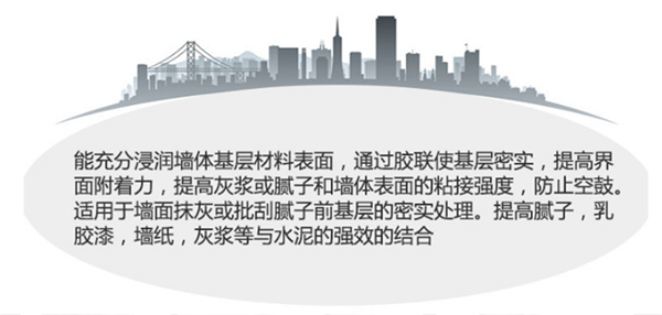 能充分浸潤墻體基層材料表面,通過膠聯(lián)使基層密實,提高膩子,乳膠漆,墻紙,灰漿等與水泥的強(qiáng)效結(jié)合