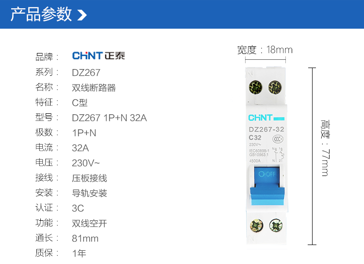 正泰(CHNT) 斷路器 空氣開關(guān) 家用空開 1P+N 雙進雙出 32A C型 DZ267